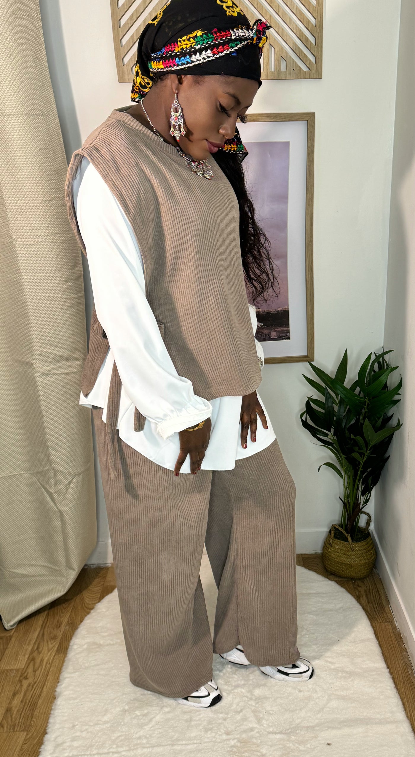 Ensemble taille unique ( chemisier blanc , gilet marron , pantalon marron )