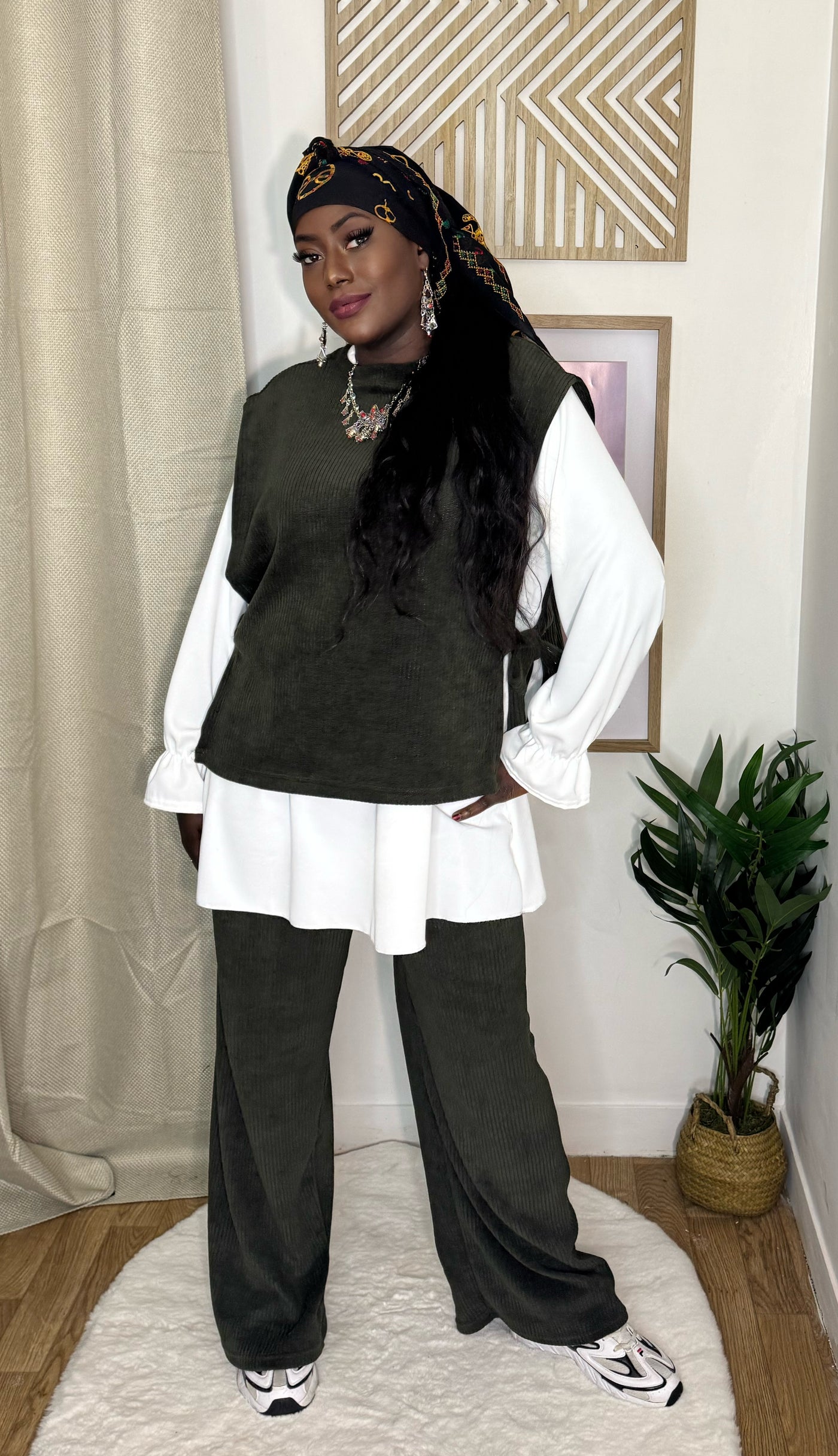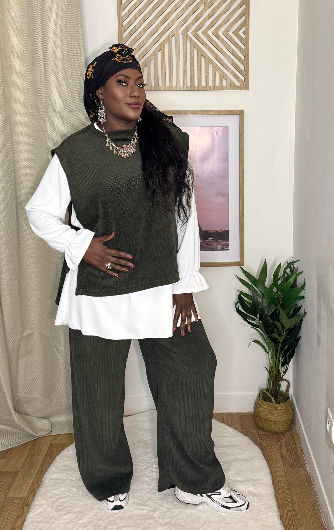 ensemble taille unique ( chemisier blanc, Gilet kaki, Pantalon kaki)
